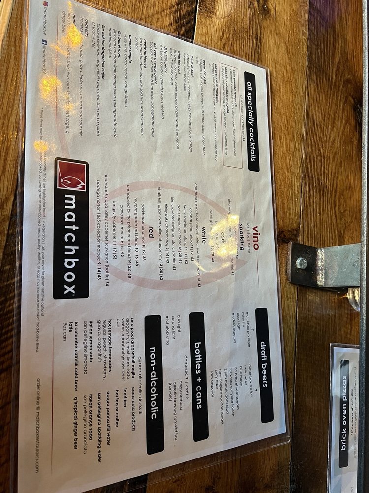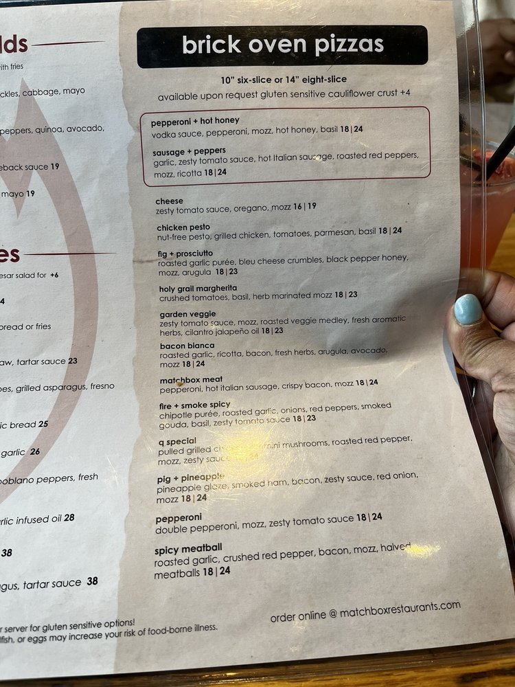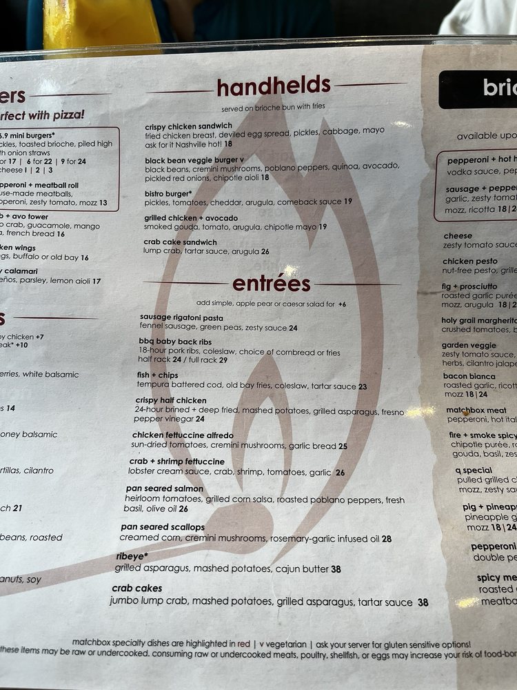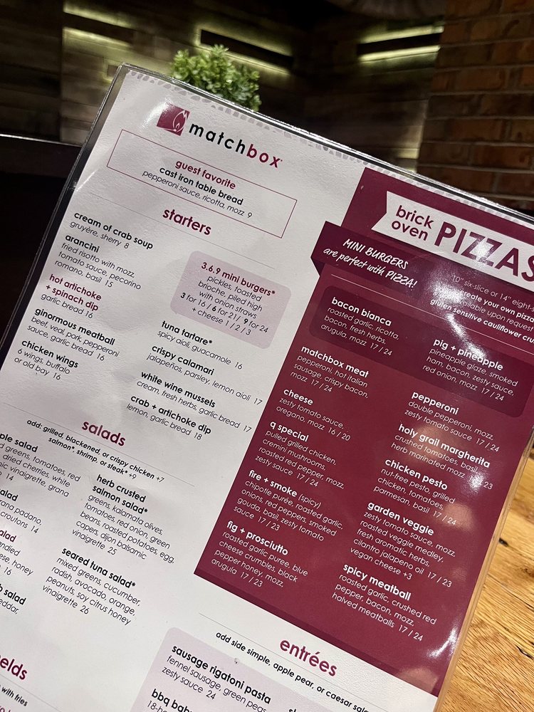 Introducing the menu at Matchbox - Pentagon City, a trendy and casual restaurant in Arlington, VA, offers a variety of options for brunch, lunch, and dinner. With a focus on quality and flavor, the menu features signature dishes like The Ultimate Breakfast Sandwich, Caramel Apple Pancakes, and Chocolate French Toast for brunch. Starters include Mini Burgers, Cream of Crab Soup, and Tuna Tartare. The salads showcase fresh ingredients like butternut squash, apples, and candied pecans. Customers rave about the great service, atmosphere, and well-prepared dishes. The fire and smoke spicy pizza with Gouda cheese and chicken is a standout, although some find the spicy sauce lacking. Overall, Matchbox - Pentagon City provides a pleasant dining experience with excellent food and attentive service.
