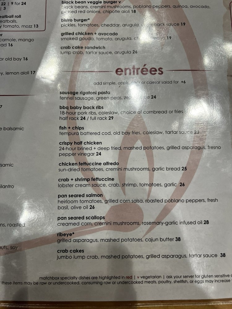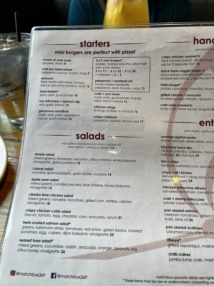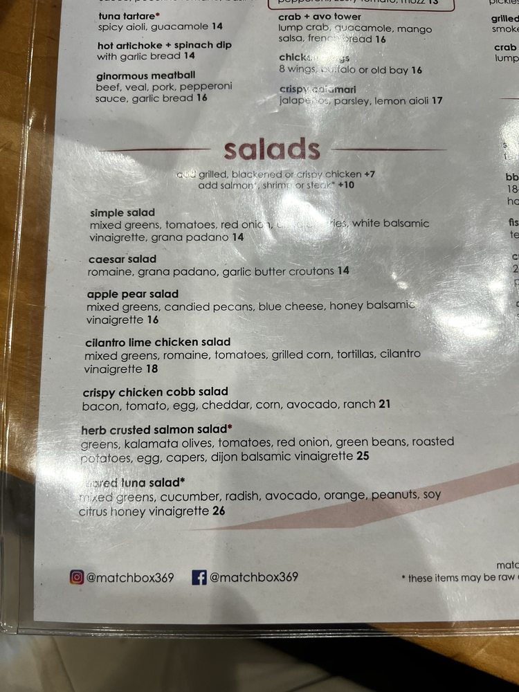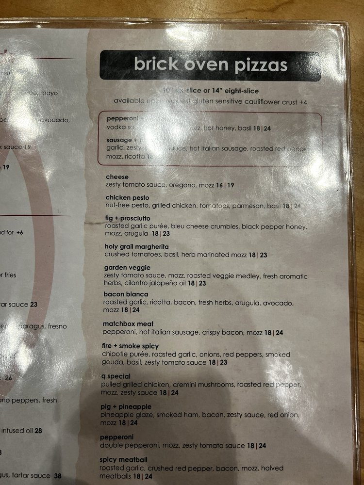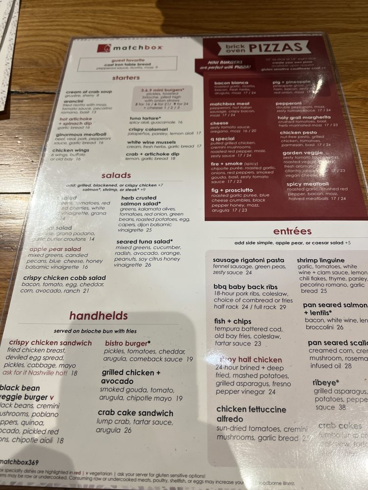 Introducing the menu at Matchbox - Pentagon City, a trendy and casual restaurant in Arlington, VA, offers a variety of options for brunch, lunch, and dinner. With a focus on quality and flavor, the menu features signature dishes like The Ultimate Breakfast Sandwich, Caramel Apple Pancakes, and Chocolate French Toast for brunch. Starters include Mini Burgers, Cream of Crab Soup, and Tuna Tartare. The salads showcase fresh ingredients like butternut squash, apples, and candied pecans. Customers rave about the great service, atmosphere, and well-prepared dishes. The fire and smoke spicy pizza with Gouda cheese and chicken is a standout, although some find the spicy sauce lacking. Overall, Matchbox - Pentagon City provides a pleasant dining experience with excellent food and attentive service.
